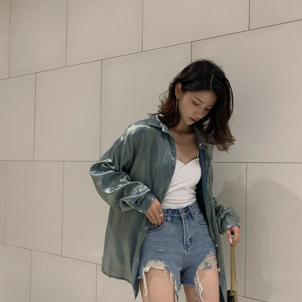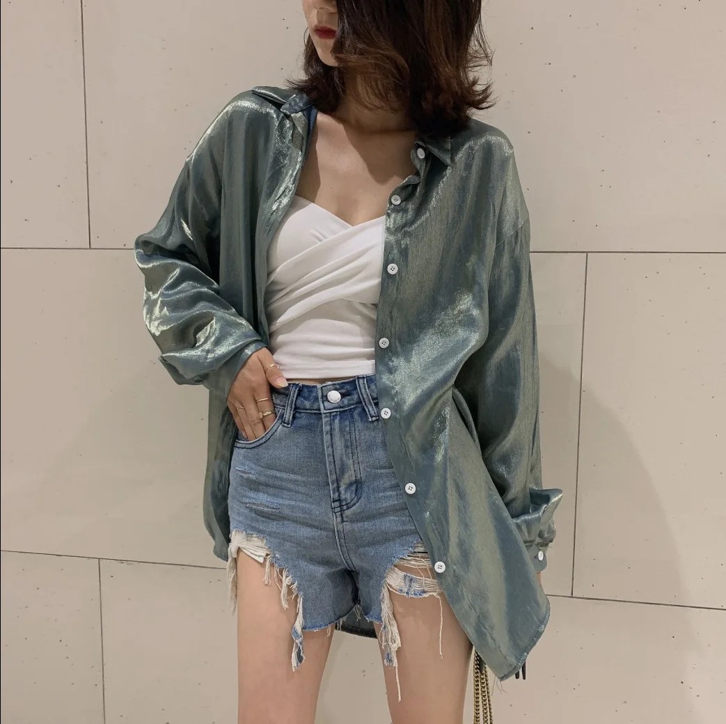 Photo Shoot 2019 Current Dark Horse! Mermaid Ji Polarized Light Blingbling Loose-Fit Shirt
